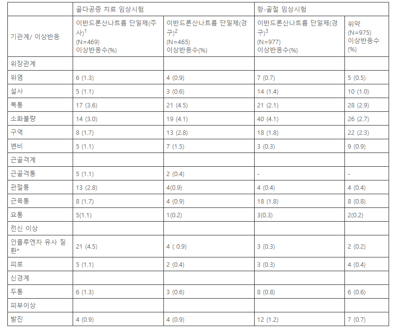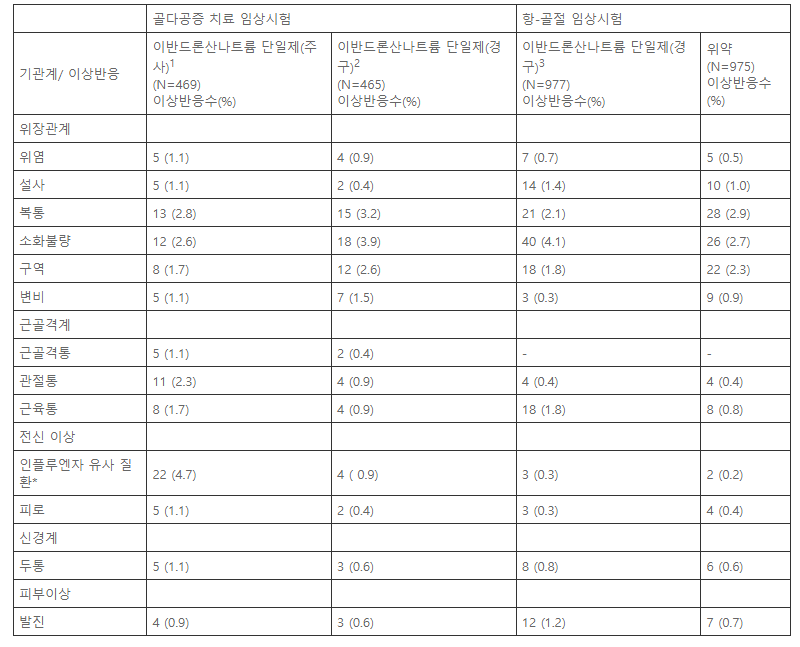 1 1년간 이반드론산나트륨 단일제(주사) 3mg을 3개월에 한번 정맥투여 2 1년간 이반드론산나트륨 단일제(경구) 2.5mg 매일 경구투여 3 3년간 이반드론산나트륨 단일제(경구) 2.5mg 매일 경구투여 * 일시적인 인플루엔자 유사 증상은 이반드론산나트륨 단일제(주사) 3mg을 3개월에 한번씩 정맥투여한 군에서 일반적으로 초회 투여와 관련하여 보고 되었다. 인플루엔자 유사 질환은 급성기 반응 또는 증상으로 관절통, 근육통, 열, 오한, 피로, 구역, 식욕상실, 뼈의 통증을 포함한다. 이런 증상들은 일반적으로 단기간, 경증-중등도의 강도이며, 치료기간 동안 의학적 처치 없이 회복되었다. 4) 골다공증 치료 임상시험에서 1% 이하로 발생된 이상반응