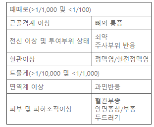 표 2 골다공증 치료 임상시험에서 2년 후(누적자료)와 항-골절 임상시험(3년간)에서 연구자에 의해 시험약과 관련 가능성이 있는 것으로 추측되는 일반적인 이상반응(>1/100, ≤ 1/10)
